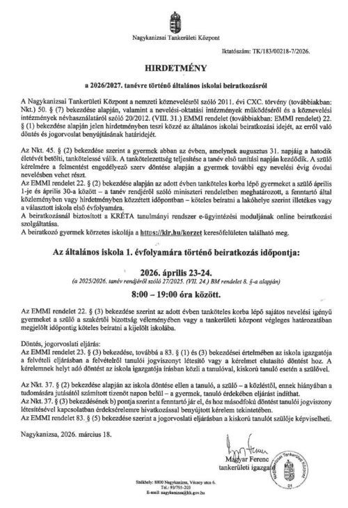 Általános iskola 1. évfolyamára történő beiratkozás időpontja: